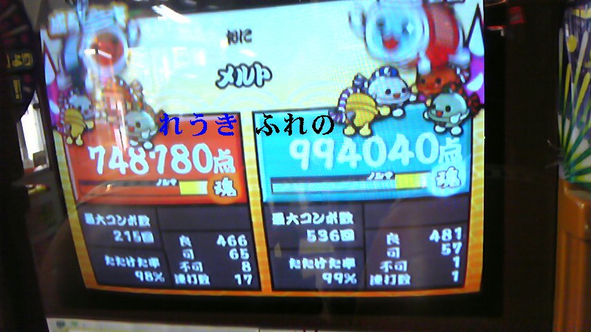 ラウンドワンで太鼓を1クレと、よく分からないゲームに1クレ。2人でプレイすると4曲なんですね、しかもライフより良メンテと来たw
